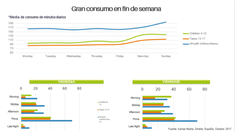 El consumo de TV es mucho más fuete en fin de semana y entre semana entre las 19:00 y las 21:00h.