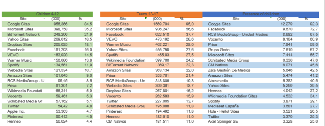 Como es de suponer los Sitesw de Google como Youtube son los líderes en alcance para este perfil.