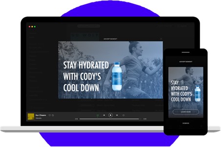 Con el formato Video Takeover, tu anuncio de vídeo aparecerá entre canciones durante pausas comerciales e incluirá una unidad de display complementaria con una URL de destino para ampliar tu campaña.