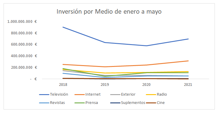 En este gráfico, observamos la inversión por medios entre enero y mayo de los últimos cuatro años, en él observamos que la TV, a pesar de ser uno de los medios que más ha caído, ya que representa la mayoría de los años el 50% de la inversión publicitaria, también ha sido el medio que más se ha recuperado en 2021, llegando a niveles superiores a los de 2019 y creciendo.