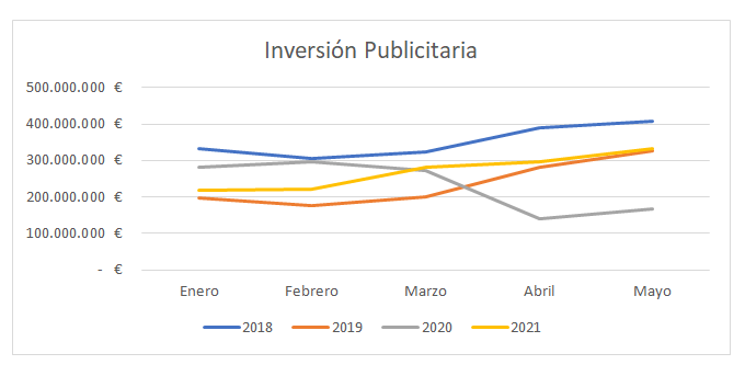 Por otro lado, también observamos que el pasado mes de mayo, hemos recuperado la inversión publicitaria a niveles superiores de los de 2019, y nos ubicamos solo a un 18% por debajo de la inversión de 2018 que fue el año de mayor inversión.