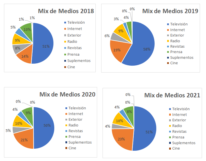 Por último, observamos la distribución del mix de medios por años, donde observamos que la inversión en TV en 2019 crece respecto al resto de medios, pero luego vuelve al 50% que suele representar en el mix.