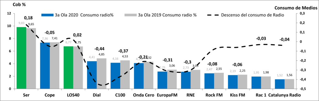 En el caso de la Radio, incluso podemos observar que la Ser y Los 40 principales gozan de un pequeño incremento en su consumo, frente a la bajada generalizada del resto de emisoras.