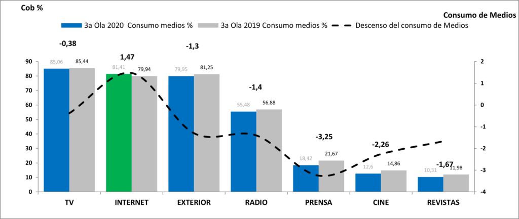 En el siguiente gráfico observamos que en el consumo de medios hay una clara bajada en prácticamente todos los medios excepto en Digital, pero cabe destacar que la bajada es más pronunciada en prensa y cine que en medios como Televisión, Radio o Exterior.