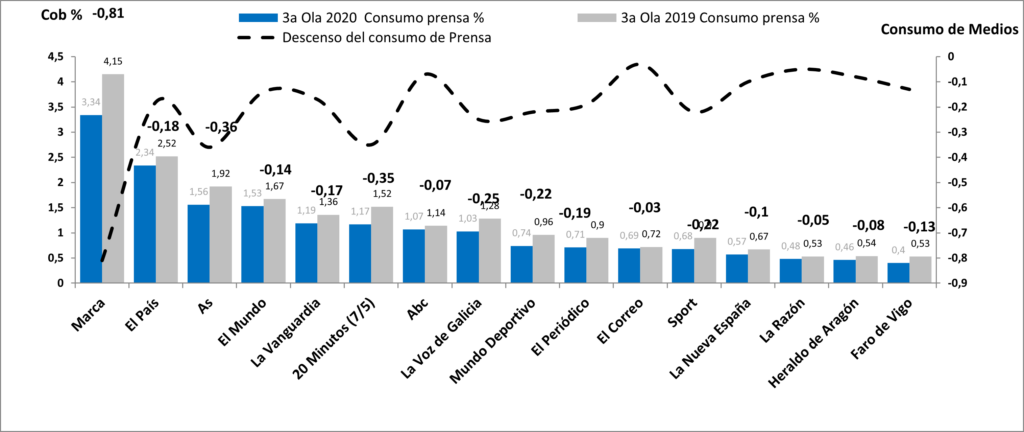 Por otro lado, si observamos la bajada de Prensa por cabeceras, si bien es generalizada en todas, nos estamos hablando de proporciones muy abruptas, por lo que pueden deberse a la tendencia a la baja general del medio que viene sufriendo los últimos años.
