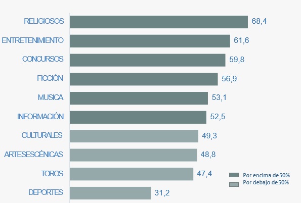 Los géneros más femeninos, según la catalogación de Kantar en el consumo de las mujeres en televisión son en primer lugar los “religiosos”, en segundo lugar la “entretenimiento” y los “concursos” en tercera posición.