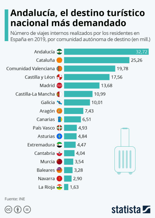 Si en 2019 Andalucía, Catalunya y la Comunidad valenciana fueron los destinos destinos favoritos de los españoles para viajar en España, en 2020 el ranking no debe haber cambiado mucho, aunque tendremos que esperar un poco para tener los datos de este verano.