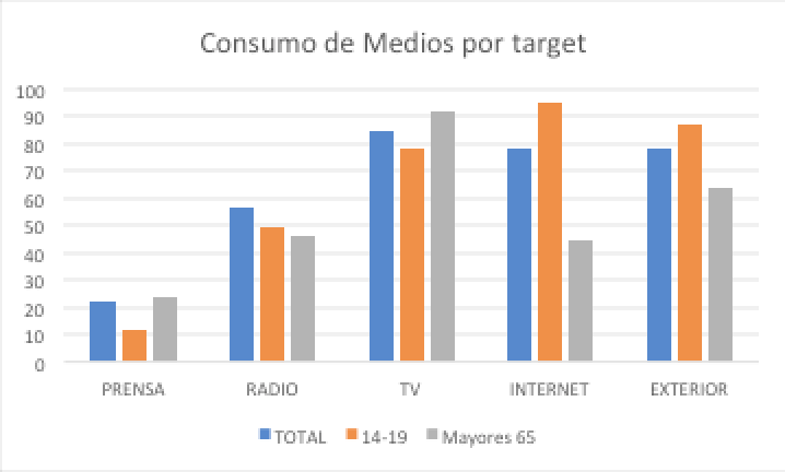 Como podemos ver en este gráfico, en el propio consumo de Medios, existen grandes diferencias en función de la edad de nuestro target, así como las hay entre sexos y zonas geográficas.