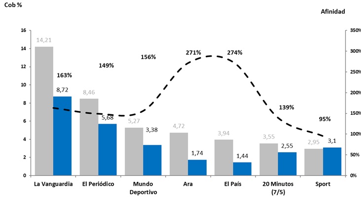 Como vemos en el gráfico del consumo de la prensa, La Vanguardia nos da una más que buena afinidad , además de ese histórico que tiene el medio con todo lo relacionado con la inmobiliaria. En el tiempo de los grandes portales on line ofreciendo ofertas inmobiliarias, La Vanguardia todavía tiene un buen hueco dentro de nuestro target…estaría bien aprovecharlo con una buena frecuencia en formatos como medias páginas o tacos portada. No descartamos encartes segmentados para subscriptores y códigos postales donde reside nuestro target.