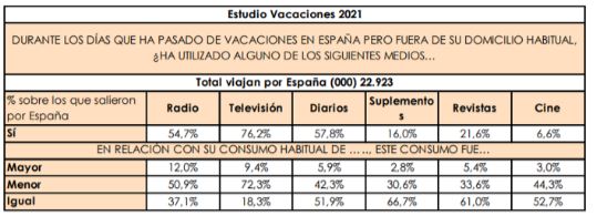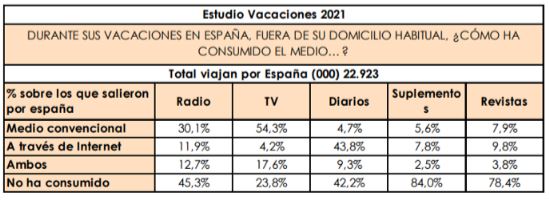 Entre aquellos que salieron de vacaciones por España, los medios preferentemente consumidos en su modo “tradicional” son Radio y Televisión. Mientras que para los medios impresos se impone la versión digital. El caso más claro son los diarios, consumidos por el 58% de los que viajaron por el país. De ellos, un 75% lo consumieron sólo en digital.