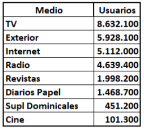 Vemos que Radio, TV y prensa son los medios más consumidos.