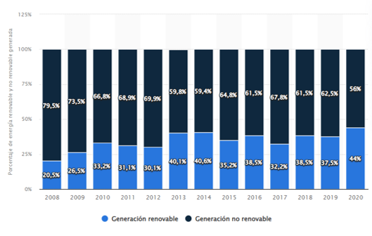 Porcentaje de energía renovable y no renovable generada en España entre 2008 y 2020. Fuente: Statista 2022