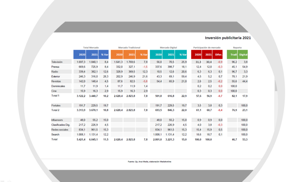 Hace un par de semanas el equipo de Arce Media nos dio a conocer la inversión publicitaria en 2021, tanto en Medios como en Ingresos y Sectores anunciantes, de la parte publicitaria “above the line”. Destaca la recuperación respecto al fatídico 2020, que ha supuesto un + 11.5% y superar los 6.000 millones de euros. Como “highlights” destacamos: