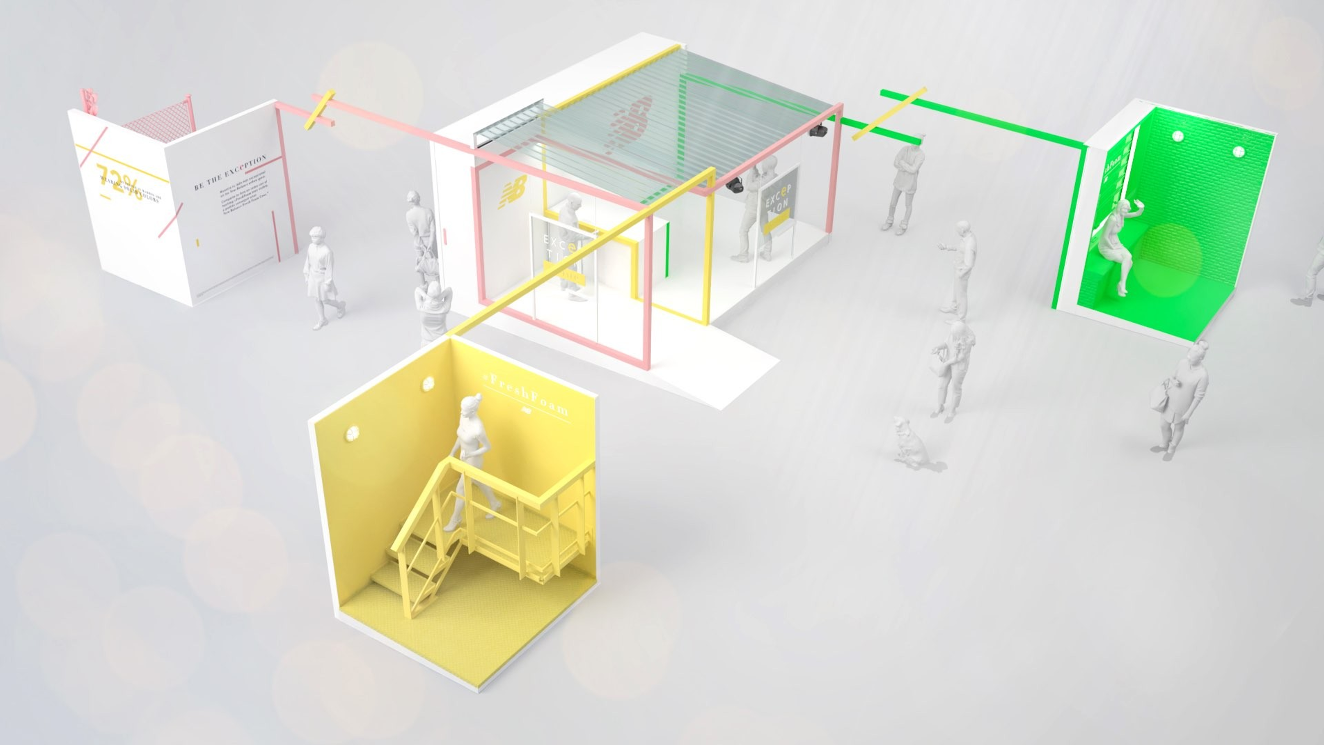 Junto con Wildbytes y New Balance diseñamos el mejor entorno posible para la acción, intentando crear diversos espacios donde la gente podía interactuar para evitar centrar el 100% de la atención en el Booth principal donde íbamos a regalar zapatillas a todas aquellas chicas que fueran seleccionadas por nuestro software por ser Excepcionales.