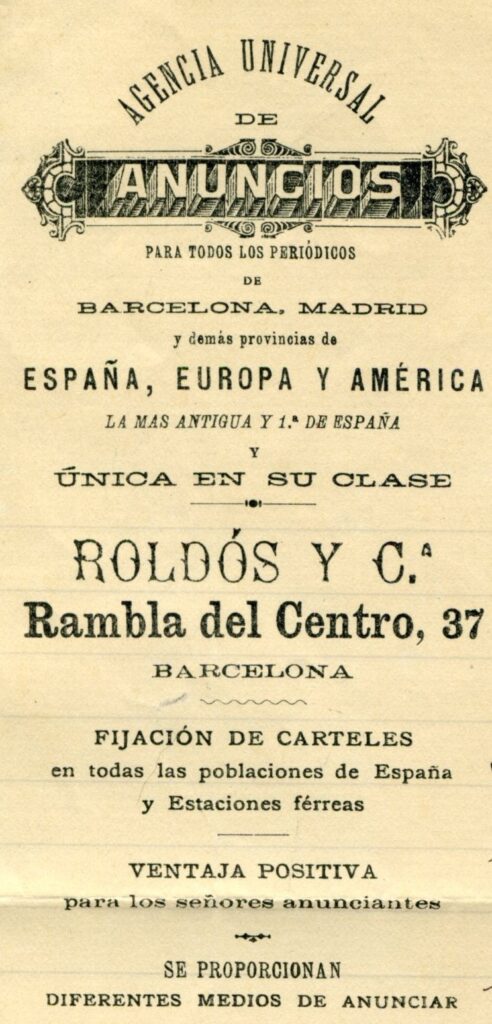 El caso es que, allá por 1872, don Rafel Roldós Viñolas -tras años de experiencia profesional como agente de publicidad y de otros proyectos empresariales- tuvo el valor de fundar, en un pequeño local de la céntrica calle Escudellers de Barcelona, el centro de Anuncios Roldós y Compañía, una embrionaria agencia de publicidad orientada a la tramitación de anuncios y que presumía de ofrecer “grandes ventajas para el anunciante”. O, lo que es lo mismo, fue el año en que nací yo. Mis mocedades estuvieron marcadas por un rápido crecimiento, impropio en los tiempos de que hablamos, donde se empezaban a dejar atrás largos años de hambruna y de miseria. Por lo que me contaron, tuve una importante labor en la configuración de la fisonomía de la ciudad en tanto que participé activamente en el hilado de su tejido empresarial, en tanto que impulsé su actividad comercial a través de una nueva herramienta: los anuncios. A finales del siglo XIX -tras el derribo de las murallas que delimitaban el centro de la ciudad, la implementación del Ensanche de Barcelona y la revolución industrial y textil que se produce con fuerza en Catalunya- Barcelona se transforma. A partir de ese momento, las fronteras se empiezan a desdibujar y todo y todos empiezan a ser accesibles.