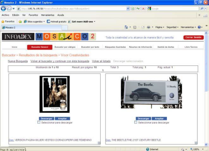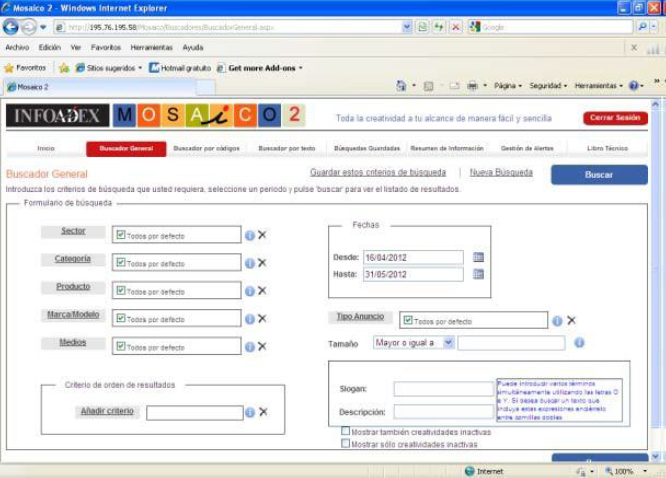 Sistema de búsqueda múltiple por: descripción, slogan, marca (modelo, sector, categoría, producto, medio, código de creatividad, personajes y motivos, etc…).