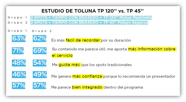 La mención de 2 minutos consigue dejar una mayor huella, recordándose un 61% más más que la publicidad convencional. Las menciones gracias a su duración, a la prescripción de personajes de la cadena y, en definitiva, a su integración con contenidos, son percibidas por los espectadores como un tipo de publicidad que le aporta más información que un spot convencional, más creíble e incluso tiene más influencia a la hora de la toma decisión de compra. Dependiendo de la forma de ese mensaje, puede hacer caer en la monotonía y corremos riesgo de que no se preste la debida atención y cambien de canal. Ha de ser una TP fresca, con ritmo, imágenes que nos hagan prestar más atención.