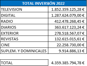 A día de hoy, Televisión sigue siendo el medio que mayor inversión publicitaria recibe, con una diferencia de 650.735€ con el siguiente, que es Digital.