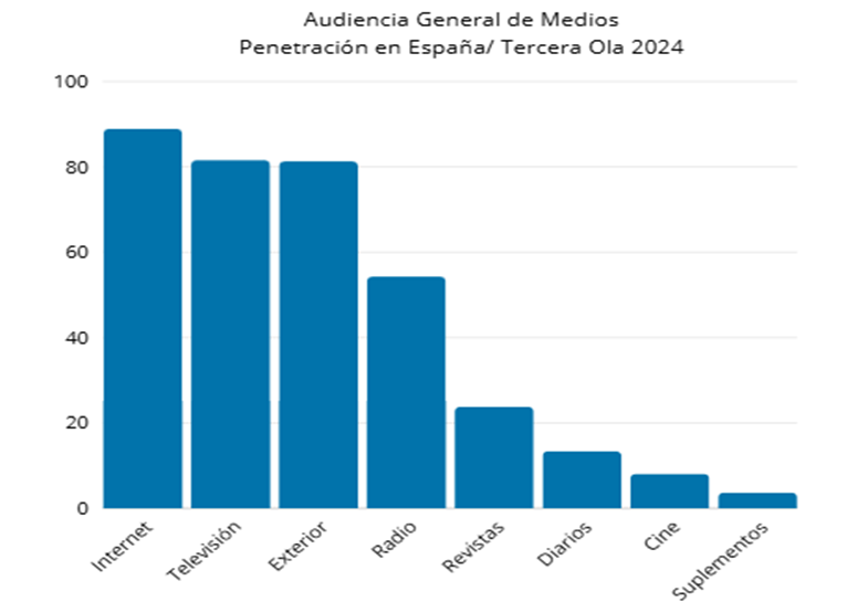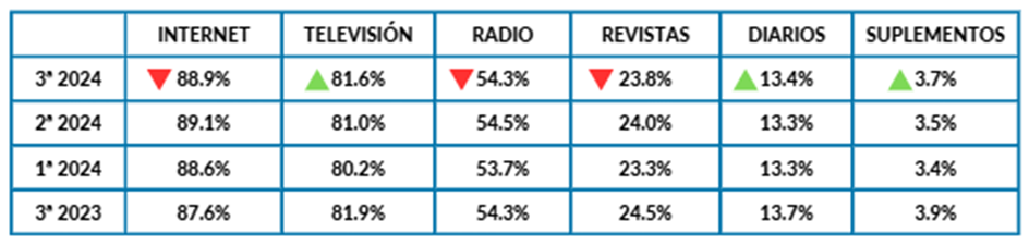 Internet encabeza esta oleada como el medio con mayor audiencia, manteniendo un crecimiento continuo, debido a la gran participación de los Buscadores como Google. Aun así, las redes sociales han sufrido un descenso significativo, con una caída de un 11% en este 2024, con el porcentaje más bajo de estos últimos años. Las causas de esta afectación se ven marcadas por: