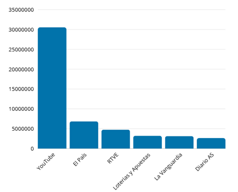 YouTube lidera como página web con más visitas. Le sigue páginas como El País, RTVE.es, La Vanguardia y Diario AS.
