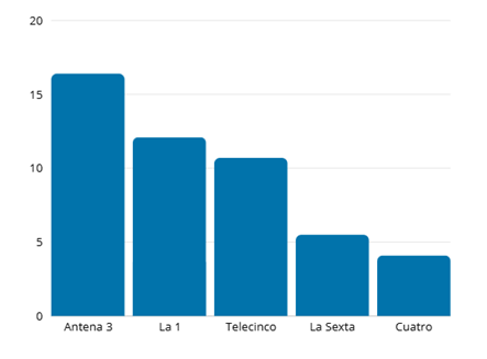 La televisión, mantiene una media de 184 minutos por espectador diario. La cadena líder en audiencia es Antena 3 (16.4 minutos por espectador), le sigue La 1 (12.1 minutos), Telecinco (10.7 minutos), La Sexta (5.5 minutos) y La Cuatro (4.1 minutos).