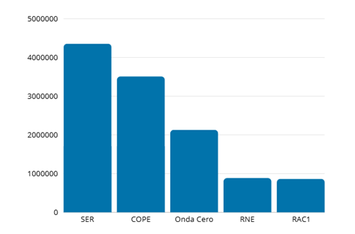 La cadena de radio con más audiencia es Cadera SER, con un total de 4.158.000 oyentes y con una media de 29.6 minutos por persona y día, siendo la cadena con el share más alto. Le sigue la COPE, con una audiencia de 3.338.000 y una media de 24.2 minutos. Onda Cero le sigue con 1.980.000 oyentes y 12.7 minutos de escucha diaria. Y continua con RNE y RAC 1.