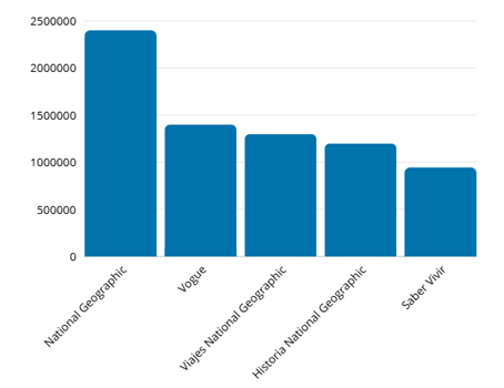 Según las revistas mensuales, la encabeza National Geographic con un 2.4 millones de lectores mensuales, le sigue Vogue con 1.4 millones, Viajes National Geographic con 1.3 millones, Historia National Geographic con 1.2 millones y Saber Vivir con 945 mil lectores al mes.