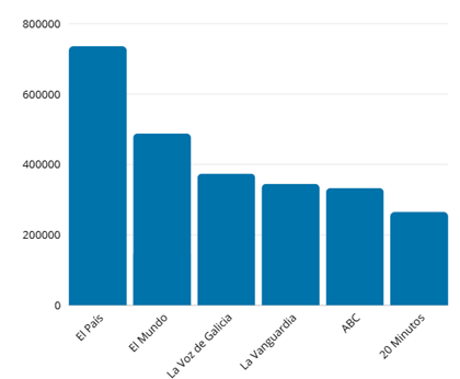 Los diarios registran un total de 5.512.000 lectores diarios. El líder de lectores lo tiene Marca, con 978.000 lectores diarios. Le sigue El País, con 736.000, El Mundo con 488.000 lectores, AS con 447.000 y La Voz de Galicia con 374.000 lectores al día.
