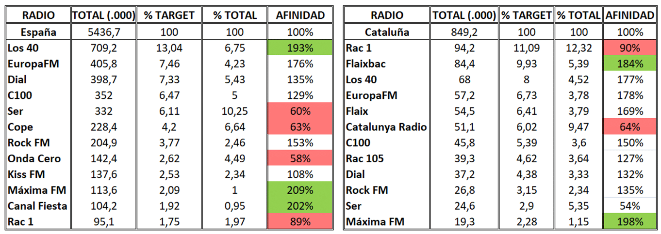 La radio, en general, no es el medio que mayor cobertura nos proporciona sobre el target millenial. No obstante si desgranamos el consumo que hacen de este medio, nos damos cuenta que hay medios que nos proporcionan una altísima afinidad con el target, y es que los millenials los encontramos en las emisoras musicales con (obviamente) contenidos para jóvenes.