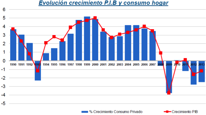 - Respecto a la previsión para 2014, Funcas (Fundación de las Cajas de Ahorro) opina que se producirá un crecimiento en el PIB del 1%, y de un 0.7% en el consumo de los hogares, cifra todavía baja ya que el crecimiento estable del consumo se producirá cuando haya una disminución del paro, que ha mejorado en el segundo semestre del año anterior, y se prevé que apenas cambie en 2014, manteniendo el porcentaje actual.