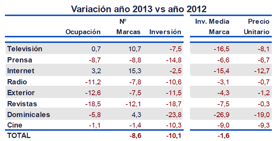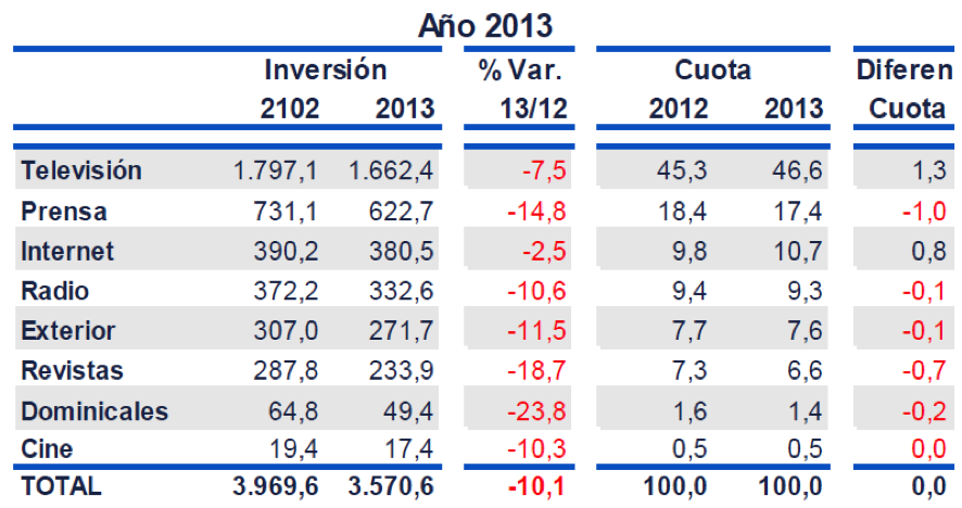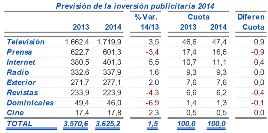 - Por ello, la previsión de la Inversión Publicitaria para 2014 es pasar de 3.570 millones de euros a 3.625, o sea un crecimiento del 1.5% (la evolución de la inversión en publicidad suele anticipar la evolución de la situación económica general). Esta mejora no afectaría a los medios gráficos, que perderían participación de mercado. La previsión por medios: