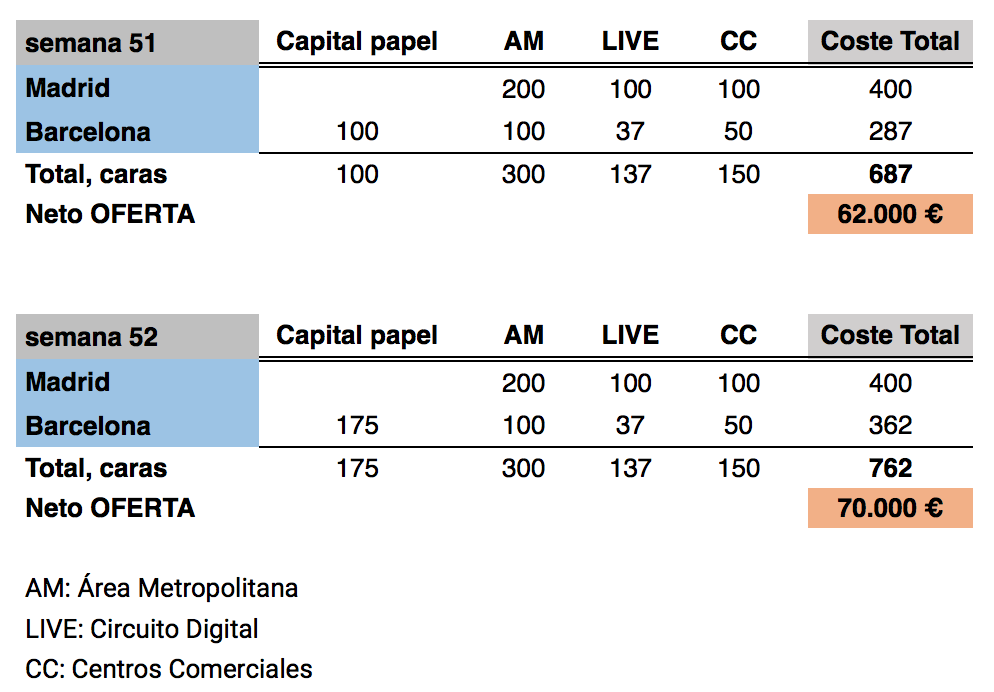 Oferta para las semanas 51 y 52 para un circuito de Mobiliario Urbano en papel y en digital para Barcelona y Madrid.