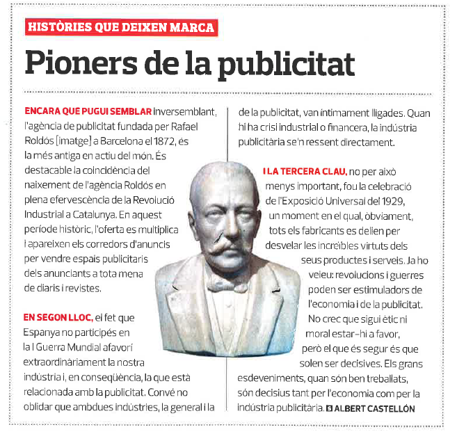 Albert Castellón, el autor de la nota, nos recuerda el contexto histórico del que nació la agencia Roldós, la efervescencia de la Revolución Industrial en Catalunya. Posteriormente señala dos hitos históricos que la publicidad en Catalunya y en consecuencia nuestra agencia no puede pasar por alto: la no participación de España en la I Guerra Mundial y la Exposición Universal de Barcelona de 1929. Ambos hechos marcaron positivamente la historia publicitaria y seguramente fueron causantes de que hoy estemos escribiendo esto.
