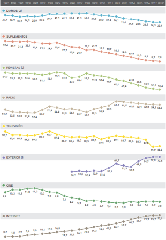 La tendencia a la baja de los medios escritos continúa sin tocar fondo. La radio, si bien año a año deja por el camino algunas décimas, mantiene unos resultados muy parecidos a los de los años anteriores. La televisión, tras 5 años de pérdida de penetración, logra romper la tendencia con un tímido crecimiento de 4 décimas y sigue siendo, con diferencia, el medio con mejor penetración. En la pugna entre exterior e internet, empate técnico con un 77% de cobertura.