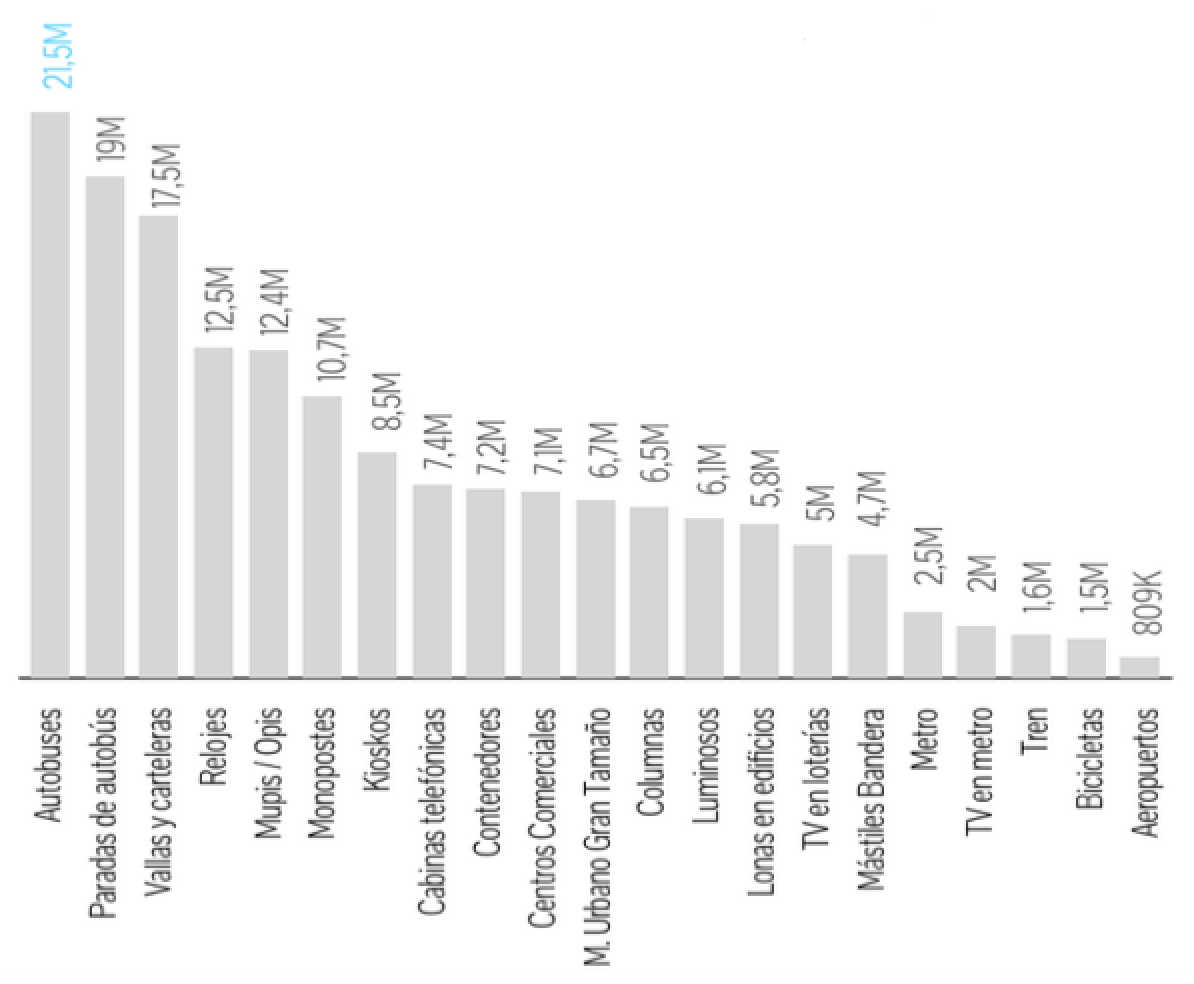 La publicidad exterior prácticamente se mantiene con los mismos números del anterior estudio (decrece 2 décimas). Como siempre, los reyes de la urbe siguen siendo los autobuses gracias a su naturaleza móvil, sus posibilidades creativas y la espectacularidad de los formatos integrales.
