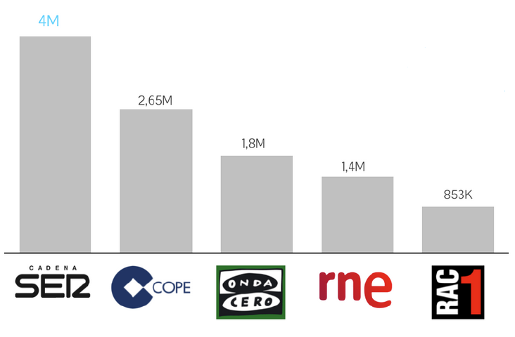 Quien más ha sufrido esta vez ha sido “La COPE” con una pérdida de 223.000 oyentes que suponen casi un 8% de su audiencia con respecto al último EGM. Pero no es la única; el traspiés no es menor para la cadena líder del país, la SER deja por el camino a más de 146.000 oyentes, RNE 127.000 y Onda Cero a 93.000.